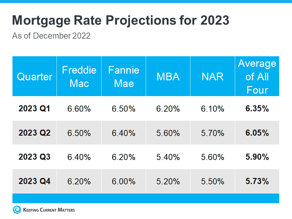 Right now, experts are factoring all of this into their mortgage rate forecasts for next year. And if we average those forecasts together, experts say we can expect rates to stabilize a bit more in 2023. Whether that’s between 5.5% and 6.5%, it’s hard for experts to say exactly where they’ll land. But based on the average of their projections, a more predictable rate is likely ahead (see chart below):